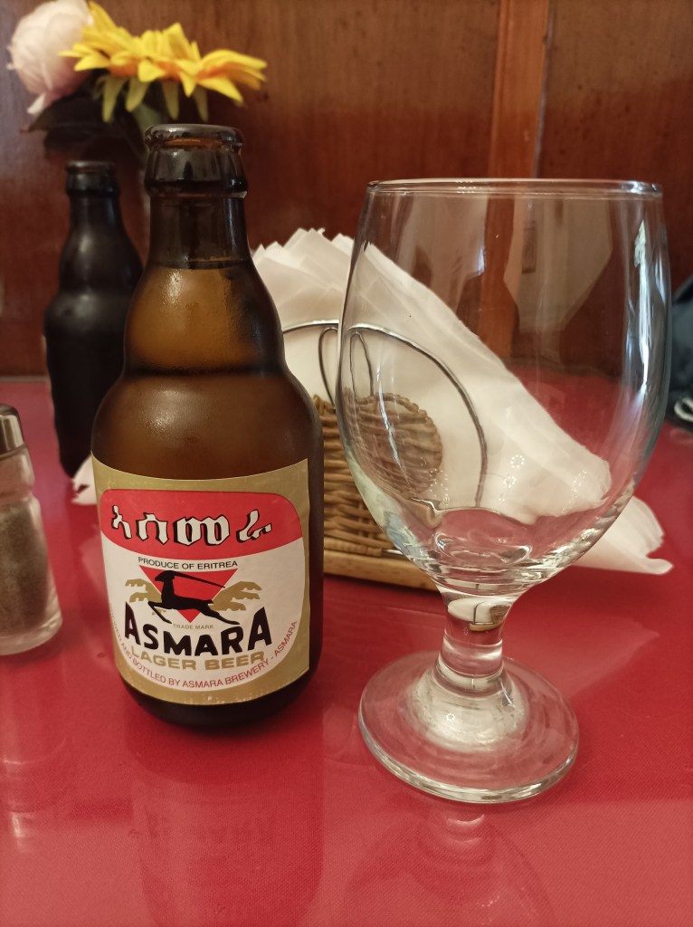 Naravno, tek ponešto znamo o hrani pa pitamo kako uopće naručiti, da li je jedno jelo dovoljno za dvoje? Konobarica nam govori da je najbolje da naručimo jedno jelo, i onako je običaj jesti zajedno pa da onda vidimo hoće li nam biti dovoljno. Već to pomalo iznenadi, jer u restoranima kod nas bi ti vjerojatno prodali dva jela pa ako vam je previše, možemo vam zamotati! Naručujemo jedno jelo, vegetarijanska opcija i lokalno pivo Asmara (ili Asmara birra, kako je to rekla konobarica). Obrok je obilan, već je sama inđera zasitna, a grahorice i povrće su više nego dovoljni da nastavimo hodati po gradu i istraživati. Prvi dan smo vjerojatno prešli 20 kilometara, trebalo nam je goriva. No, grah je grah, a naša probava se tek privikavala na nove okolnosti pa smo prva dva dana imali i “turbo pogon”, no ništa što bi se moglo nazvati ozbiljnim probavnim smetnjama.