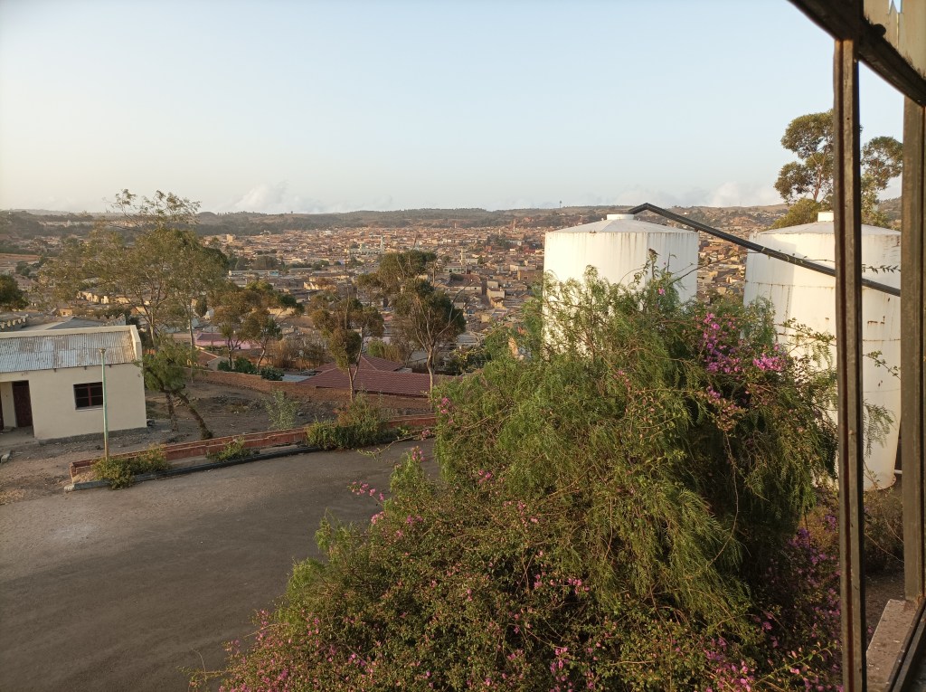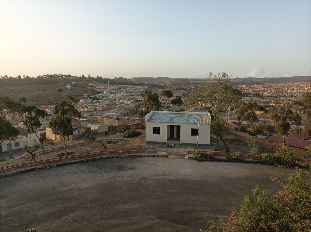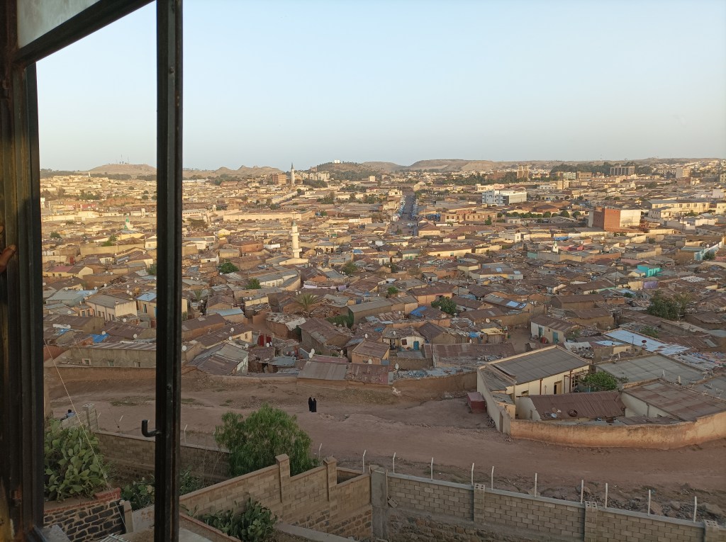 Jedan dan smo odlučili otići do bara na vrhu brda, koji izgleda poput kontrolnog tornja na aerodromu i iz kojeg se pruža pogled na cijeli grad. Ispod tog brda smo prošli par puta, lijepo se vidi s jedne od glavnih ulica, a u nekom vodiču po gradu se spominje kao kafić i restoran pa smo se zaputili vidjeti o čemu je riječ. Penjemo se gore kroz ulicu koja prolazi kroz stambeni kvart, male kuće, brojne vijugave uličice sa strane, na cesti se igraju djeca, dogovaraju se tko će s kim igrati nogomet, dvije djevojčice vuku neki ruksak po podu, neki dječaci dozivaju psa koji zainteresirano dolazi do njih, ali brzo gubi interes kad skuži da nemaju neku hranu… Klinci dobacuju “hi” i “hello” uz osmijeh, sad smo se već posve naučili na tu dinamiku, javljamo se nazad i nastavljmo u brdo. No, zgrada izgleda napušteno, a već iz daljine vidimo kako stariji čovjek ustaje, dok druga dvojica ostaju sjediti i kad smo već pomislili da bi to moglo biti to, čovjek s štakom uzvikuje “welcome!” i pruža nam ruku, pokazuje ploču na kojoj piše kad je izgrađena zgrada, pa se tu prebacujemo između engleskog i talijanskog da bi na kraju pričali samo na talijanskom. Vodi nas uz stepenice, teško hoda pa kad se čini da mu ne ide, počne plesati i izvodi malu predstavu uz smijeh. Restorana nema, ali vidikovac ima pogled u svim smjerovima, hodamo po ptičjem izmetu, a on nas vodi na svaku stranu i pokazuje, objašnjava koji dio grada vidimo “Asmara e bella, piccola Roma”., “Si, si, bellissima!”… i tako redom. Došli smo malo prije zalaska sunca, okidamo par fotografija, svjetlo je super, sunce je uvijek ogromno, nikako da se naučimo na tu činjenicu jer nemaš osjećaj nadmorske visine.
