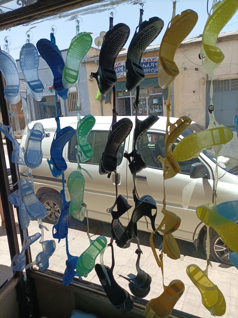 U muzeju upoznajemo i jednog od njegovih osnivača, borca u revoluciji, a to je onaj stariji čovjek u bijelom i na biciklu kojeg smo vidjeli koji dan ranije. Priča nam o nekim detaljima iz borbe za oslobođenje, opisuje kako su popravljali gumene sandale (šida) od kojih je jedna obrasla koraljima izložak u muzeju. Naime, te sandale su bile glavna obuća boraca i borkinja, a kad bi pukle, grijali bi puknute dijelove na vatri i onda ih tako “zavarili”. Bile su simbol revolucije, toliki da je u devedesetima izgrađen spomenik borbi za oslobođenje u obliku sandala. Spomenika danas nema, preseljen je prije par godina, no sandale su i dalje svugdje prisutne. I danas ih mnogo ljudi nosi, proizvodi ih lokalna tvornica, oblikom podsjećaju na sandale koje je proizvodila Jugoplastika, vjerojatno po uzoru na ove koje se nose i u drugim dijelovima Afrike. Nekad su bile od crne gume, a danas ih ima u raznim bojama, jedino što ih nema u veličini 46! Gdje god smo pitali, nema tako velikih. Obožavao sam one od Jugoplastike, a sad kad sam ih vidio u crnoj boji i s ovom pričom, to je bilo to. Nažalost, vratio sam se u patikama u kojima sam doputovao. Broj 37 su imali, tako da smo jedne ipak donijeli sa sobom.