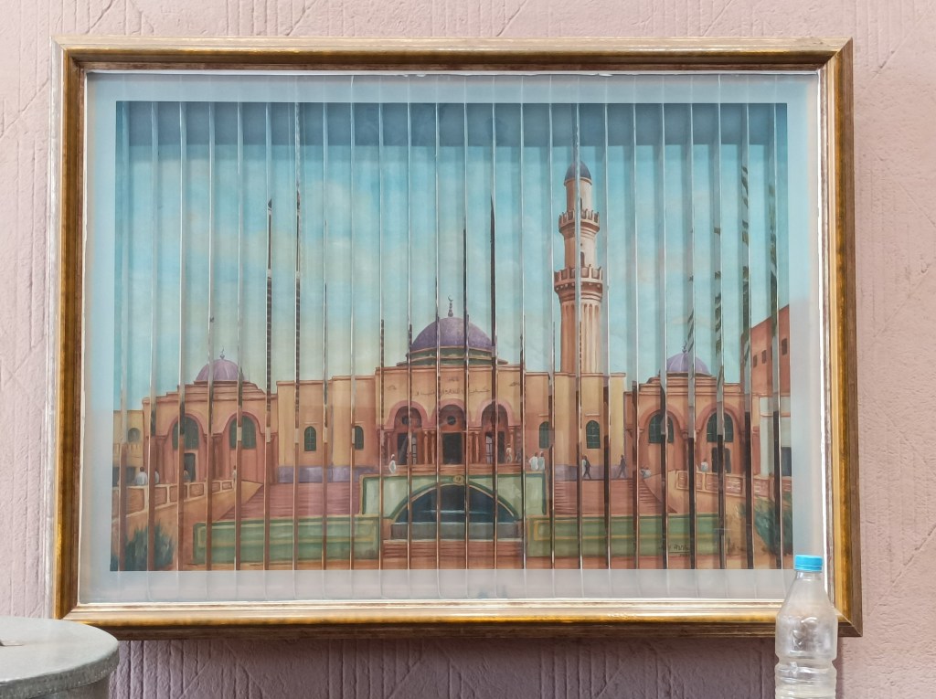 Mala tržnica s lijeva, okružena dućanima i u pozadini se vidi velika džamija Khulafa al-Rashidun.